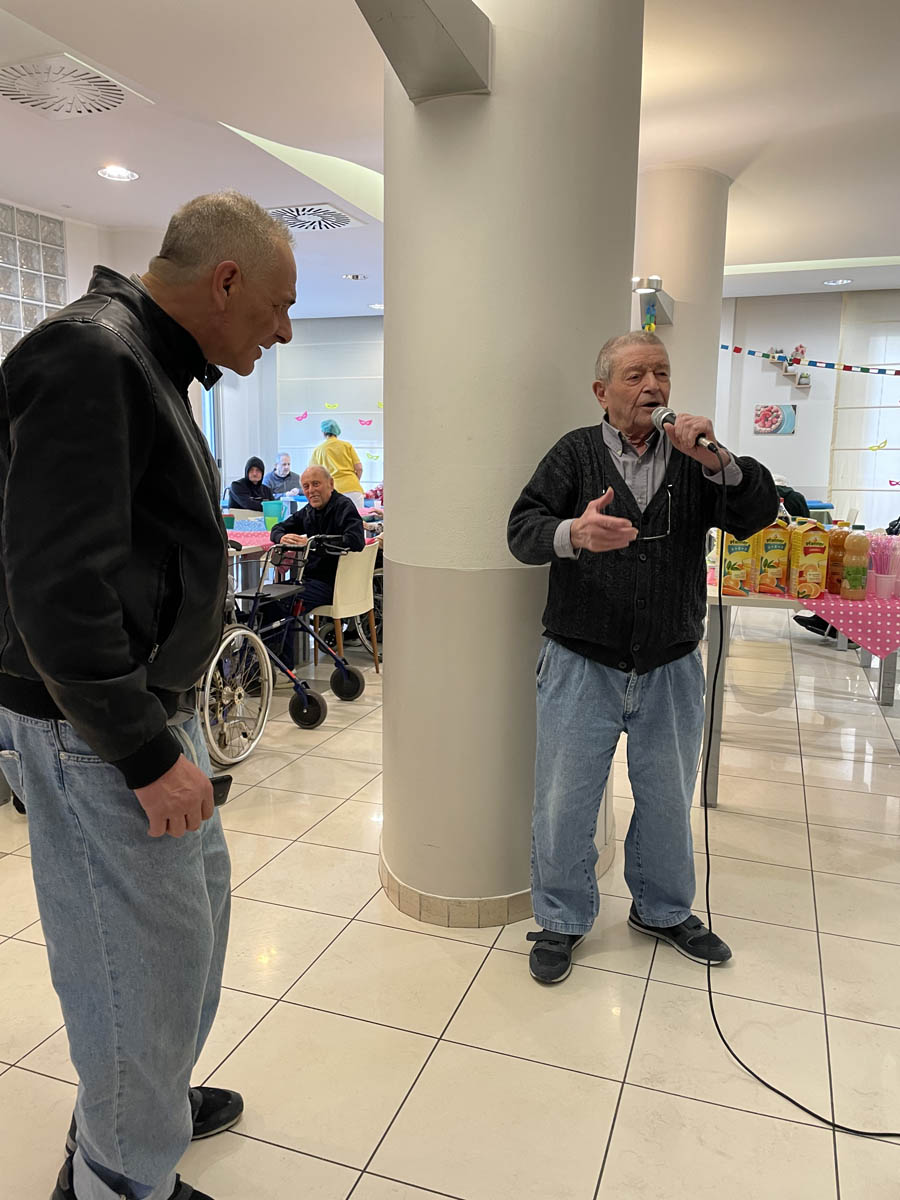 Qualcuno tra lo stupore di tutti si è alzato in piedi dalla carrozzina per ballare e altri hanno afferrato il microfono cantando a ritmo di musica gioiosi. Inoltre, nei giorni precedenti gli anziani si sono dati da fare per allestire la struttura creando maschere utilizzate per l’allestimento della stessa in attesa della grande festa. Un’esperienza davvero incredibile per gli anziani dove oltre a divertirsi moltissimo hanno anche scaricato stress e tensione ballando e cantando a squarciagola. Valerio ha fatto molto divertire gli anziani che a turno hanno scelto le loro canzoni preferite e le hanno cantate.