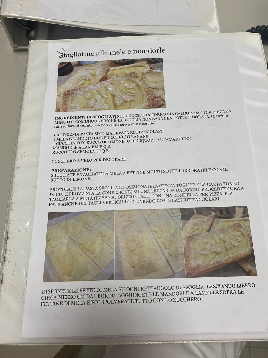 La preparazione: Al rientro, i ragazzi uniscono i tavoli della sala da pranzo, stendono le tovaglie bianche e iniziano la creazione delle sfogliatine alle mele e mandorle.