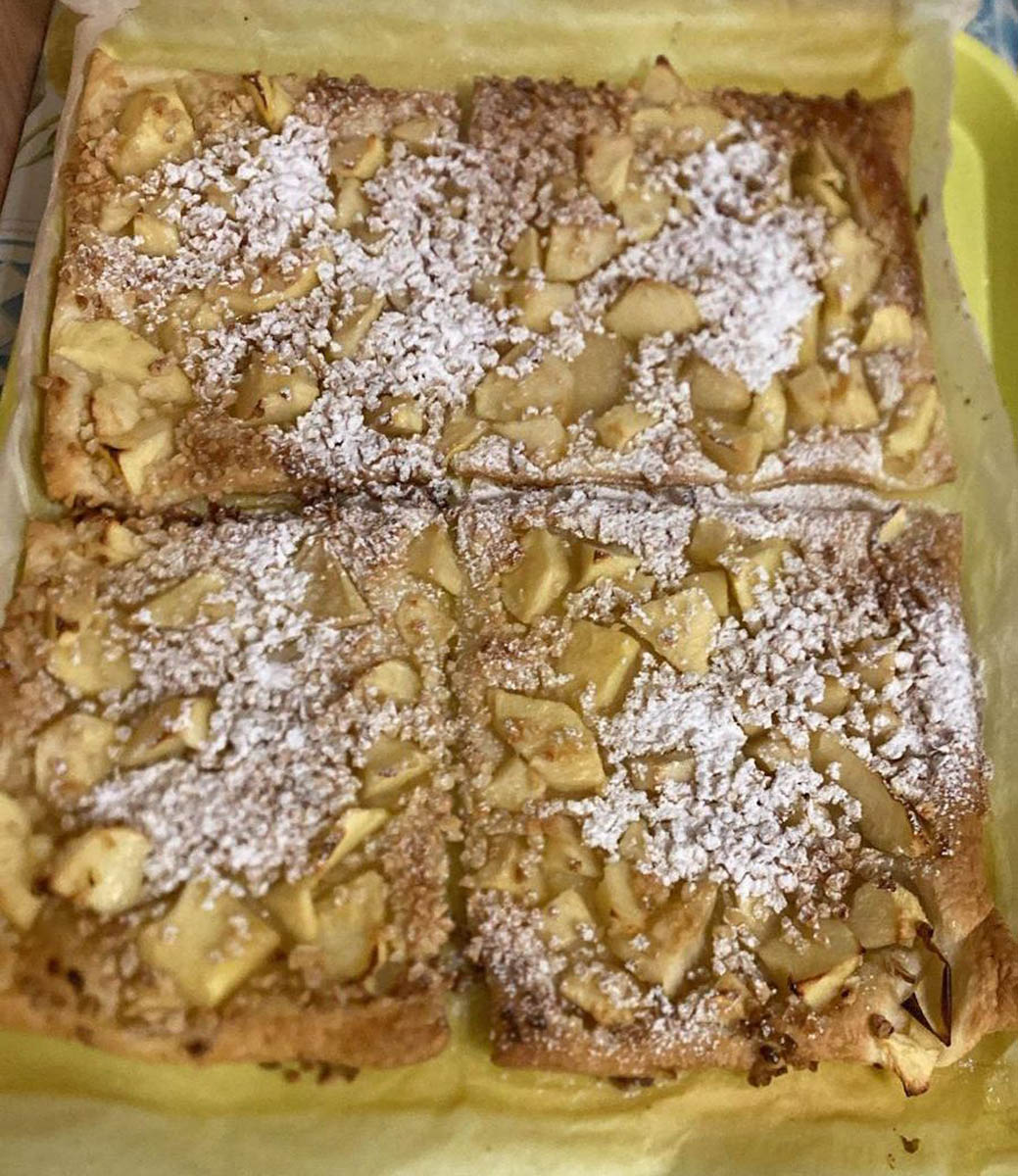 Gli ingredienti: Per la ricetta sono stati utilizzati pasta sfoglia fresca, mele, succo di limone, mandorle, zucchero semolato e zucchero a velo per la decorazione finale.